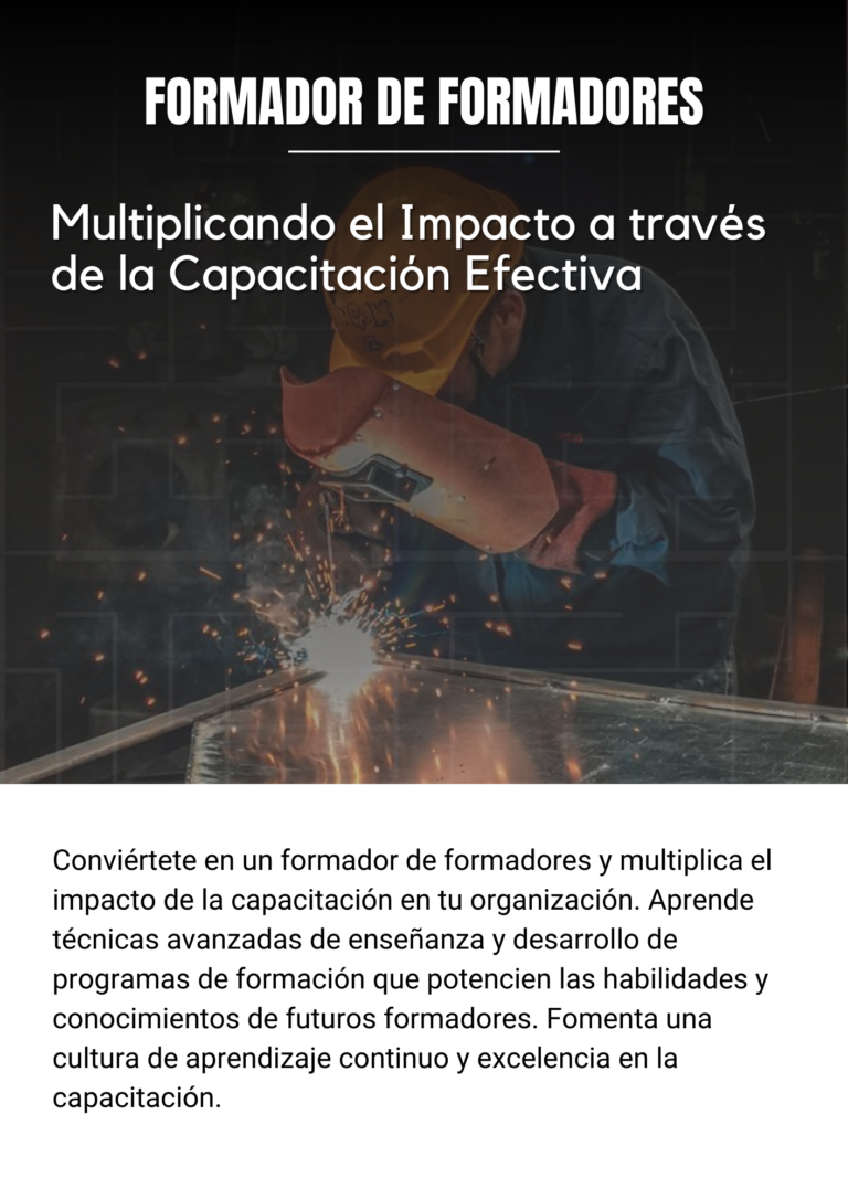 Este curso ayuda a establecer un equipo interno de formadores que puede transmitir conocimientos de manera efectiva, reduciendo costos externos y asegurando una capacitación alineada con las necesidades organizacionales.